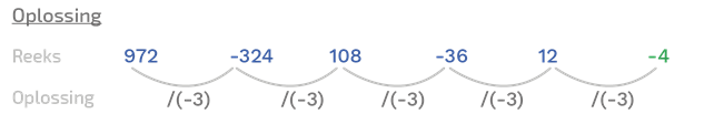 Elk getal in de reeks volgt door het vorige getal te vermenigvuldigen met of delen door een ander getal. In onderstaand voorbeeld delen we het getal beurtelings door -3.